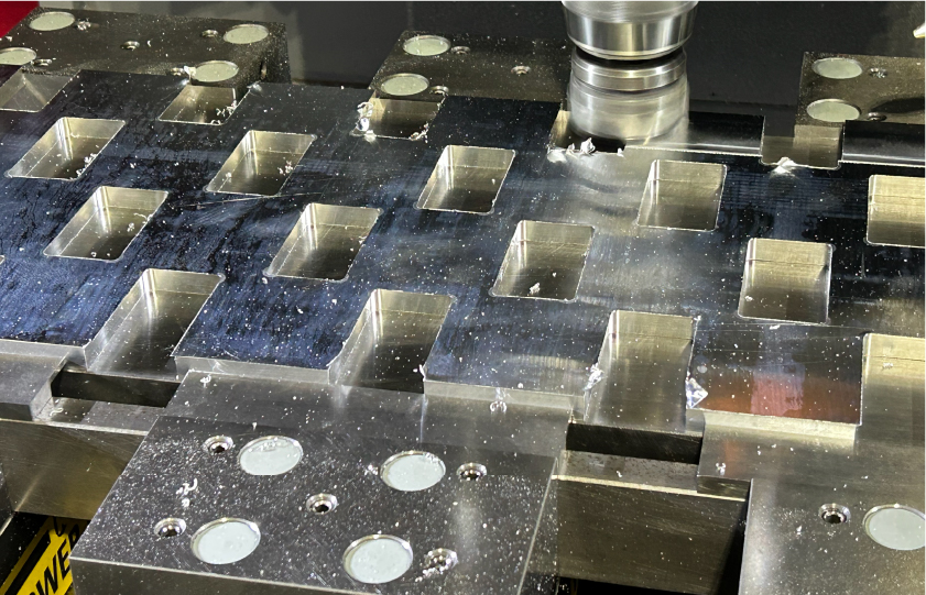 多くのワークを載せ外周の加工を1工程で仕上げるようコスト削減した例です。